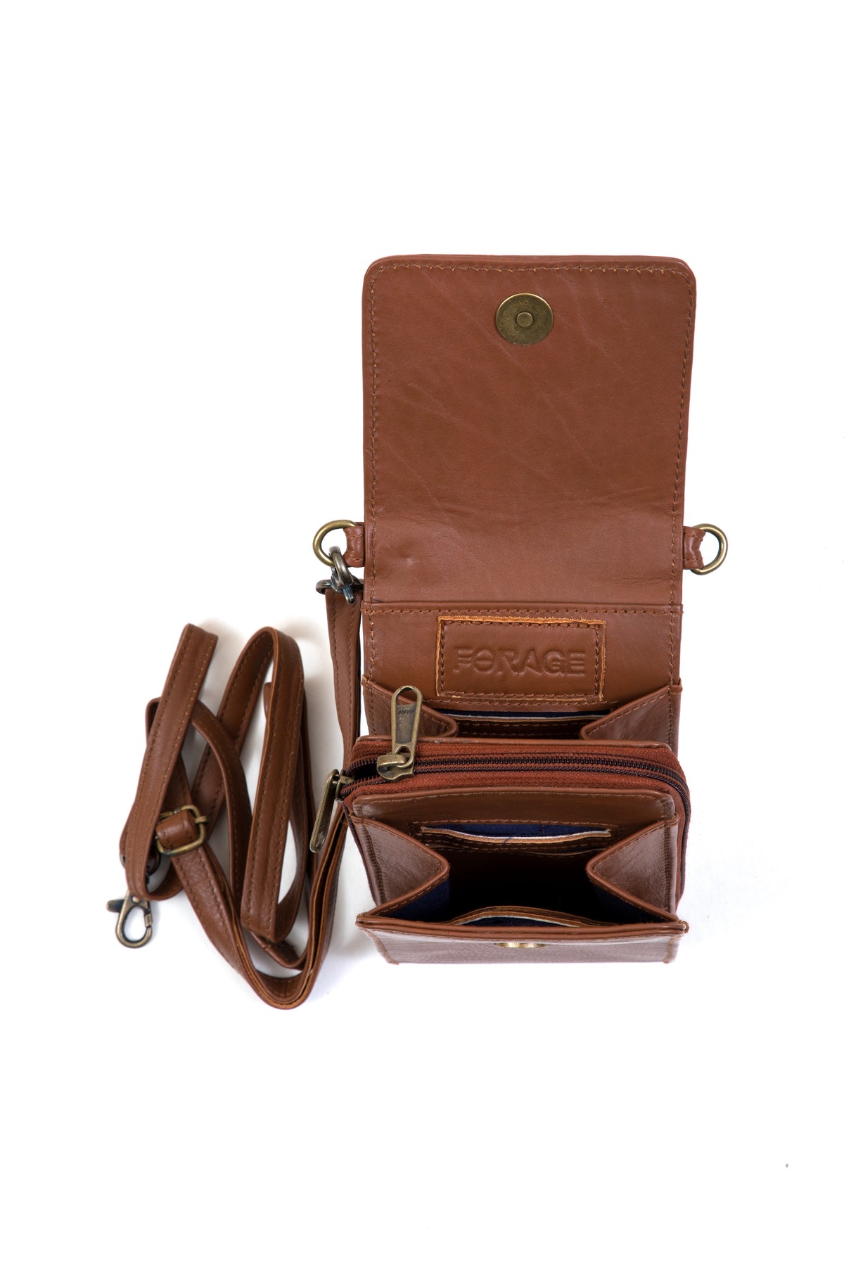 When opened, Cleo expands in a fan shape to reveal three internal compartments, making it easy to see and reach everything inside. The central pocket is designed to hold a smartphone and zips fully closed for added security, while the two outer compartments each feature four card slots, giving space for up to eight cards in total. A magnetic popper closure keeps the bag neatly closed when worn, with antique brass hardware used throughout.