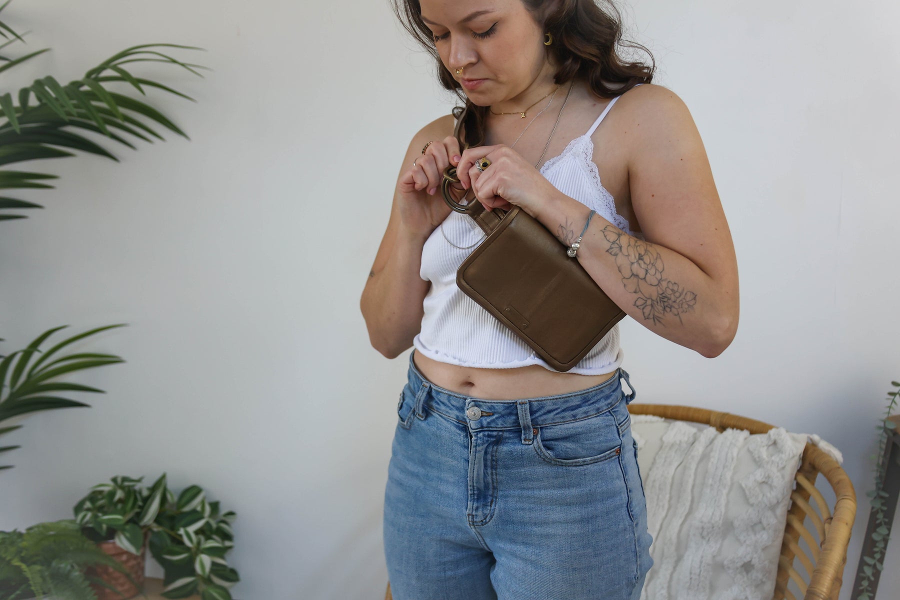 The main compartment expands to hold your phone, small wallet and keys, then zips securely closed.