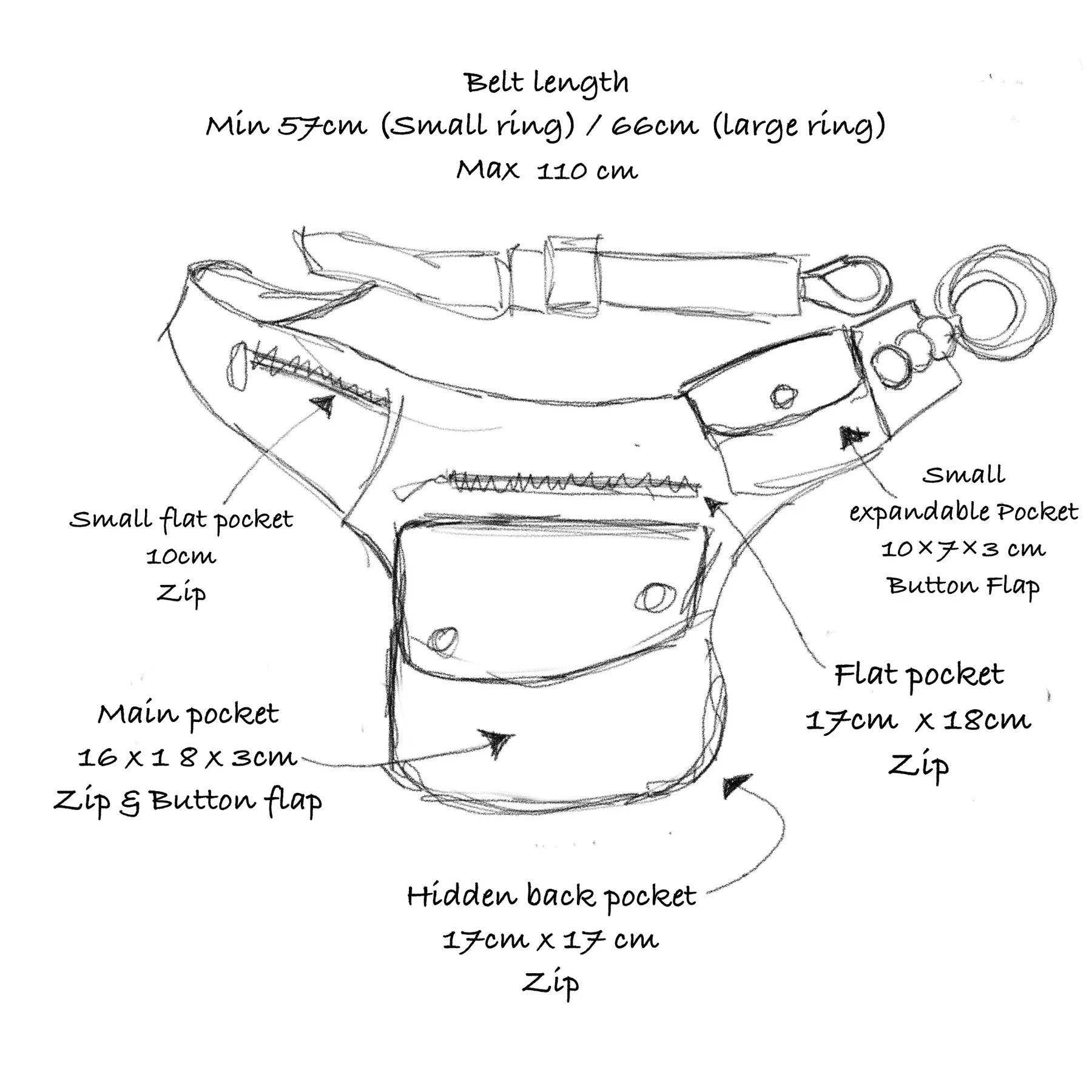 - 1 x Small flat belt pocket with zip fastening (3 _" x 1 _" approx)